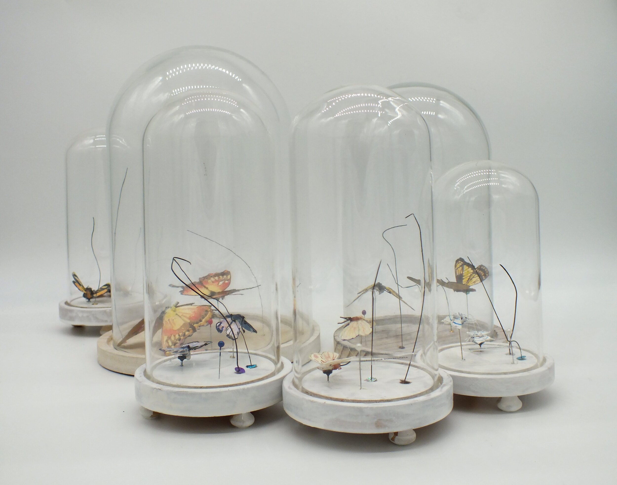 Archivo-colección de 84 especies de lepidópteros extinguidos en los últimos tres siglos. Cada registro del archivo incluye una cúpula de cristal con una pareja de réplicas artesanales de las mariposas o polillas desaparecidas, acompañadas por sus trayectorias de caída. Junto a las cúpulas, se incluyen fotografías intervenidas de fumigadores en su tarea. Las imágenes han sido tomadas de una búsqueda en Internet. Un fichero con lugares y fechas de extinción más un globo terráqueo intervenido con alfileres completan el archivo.